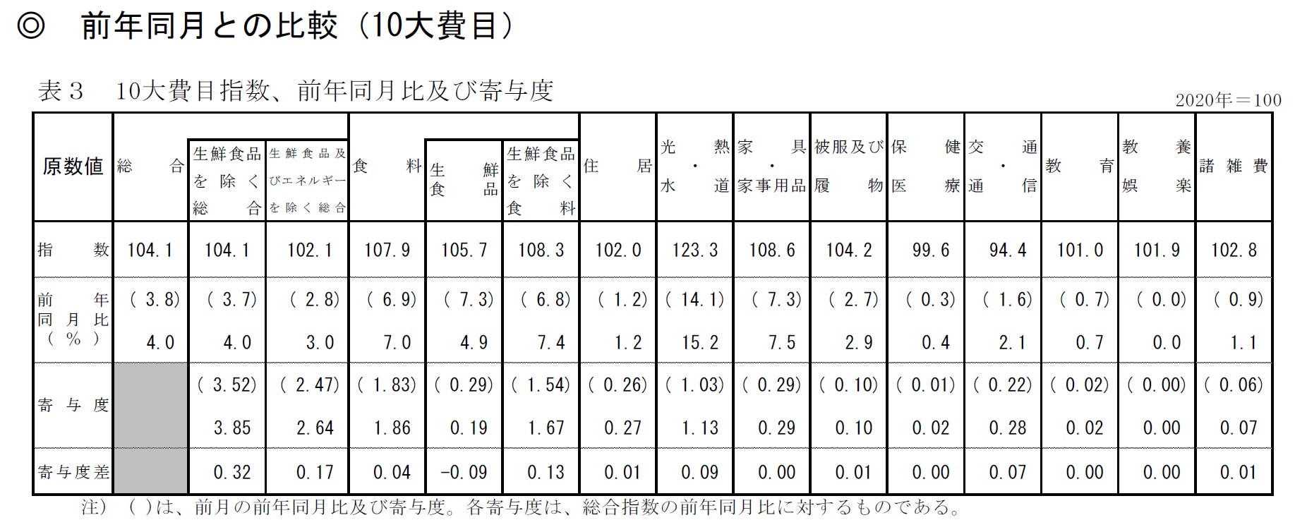 そして次に、表3を使って、前年同月の10大費目の寄与度を確認していこう。