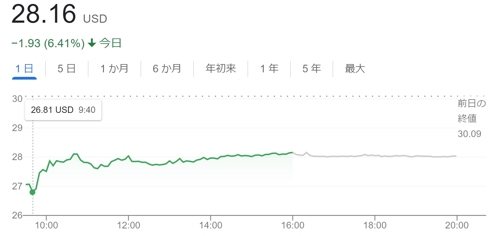 結局決算発表後の本市場取引での終値は前日△6.41%の28.16ドルで終わっている。だが、取引開始直後には一旦は安値26.81ドル(△10.9%)をつけるまで叩き売られているのを確認して欲しい。