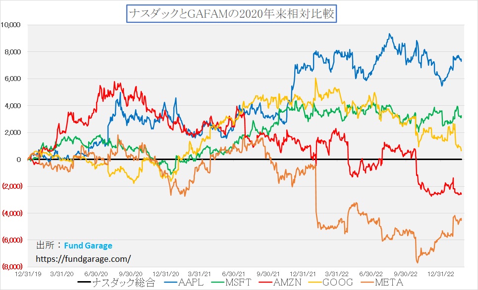 ではここで、「GAFAM」の株価チャート(ナスダックに対する相対比較のチャートに加工)を比較してみよう。