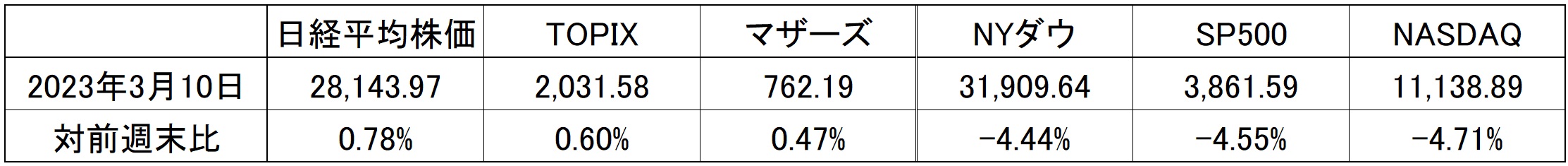 銀行株の下落がNYダウに大きなインパクトとなり、また「シリコンバレーのスタートアップ」にも影響があるだろうと考えられたことで、ナスダックも下落。週を通じた騰落率では、米国市場は総じて大きく下落した。