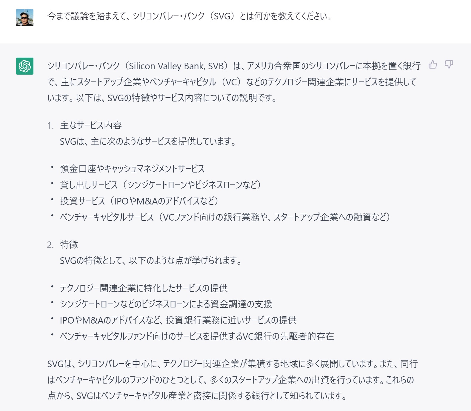 まず議論に入る前に、SVBがどのような機能を持つ銀行なのかをよくご存じない方は、以下のChatGPTの返答をご参考いただきたい。