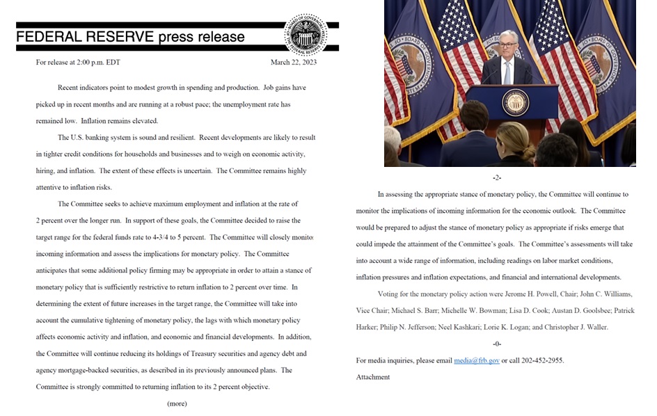 『最近の指標は、支出と生産の緩やかな伸びを示しています。雇用の増加はここ数か月で回復し、堅調なペースで進んでいます。失業率は低いままです。インフレは引き続き上昇しています。米国の銀行システムは健全で回復力があります。最近の展開により、家計や企業の信用状況が引き締まり、経済活動、雇用、インフレの重しになる可能性があります。これらの影響の程度は不明です。委員会は引き続きインフレリスクに非常に注意を払っています。』
