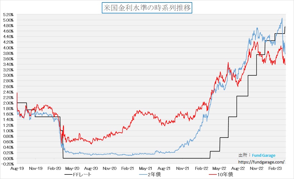 - 確かにFFレート(黒線)は0%から4.75%まで上昇した。