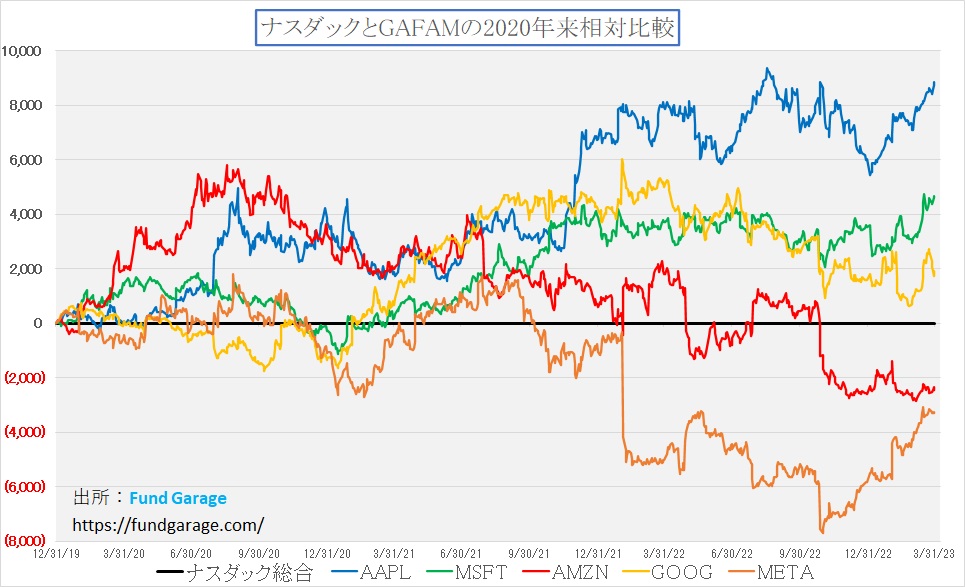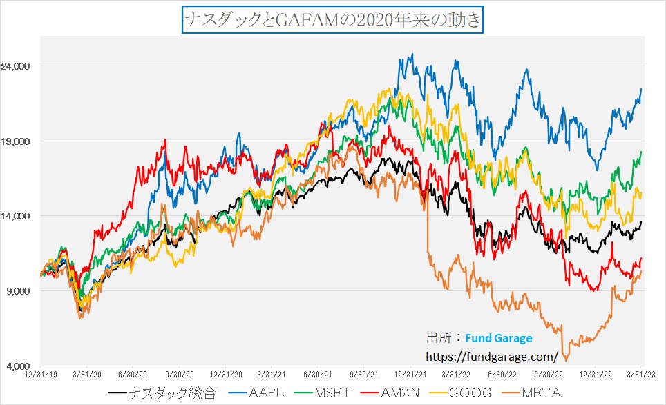 パンデミック発生の2020年以降のNASDAQとGAFAMの動きを表したのが、以下のチャートだ。
