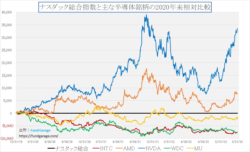 お分かりだろうか。インテル(INTC)とウェスタンデジタル(WDC)の株価は、マーケットにつられて絶対値は値上がりはしているが、相対比較では引続きアンダーパフォームに沈んでいる。