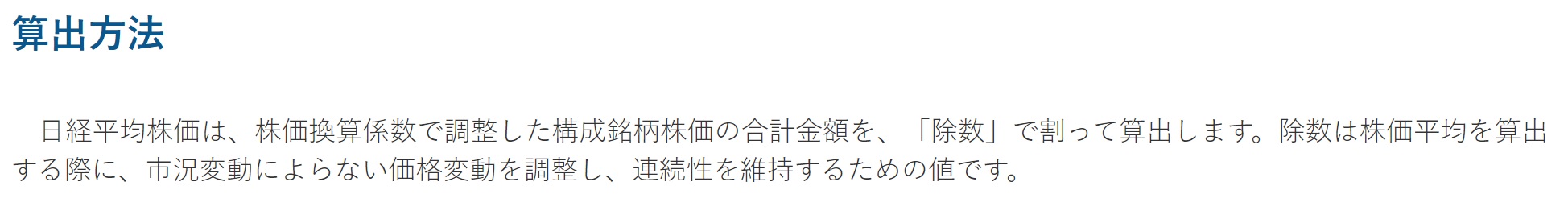 あらためて、日経平均株価の算出方法を日経新聞社のWebページから引用すれば、下記の通りだ。他にもそのWebページには日経平均株価についての豆知識になるものがあるので、是非覗いてみて欲しい。
