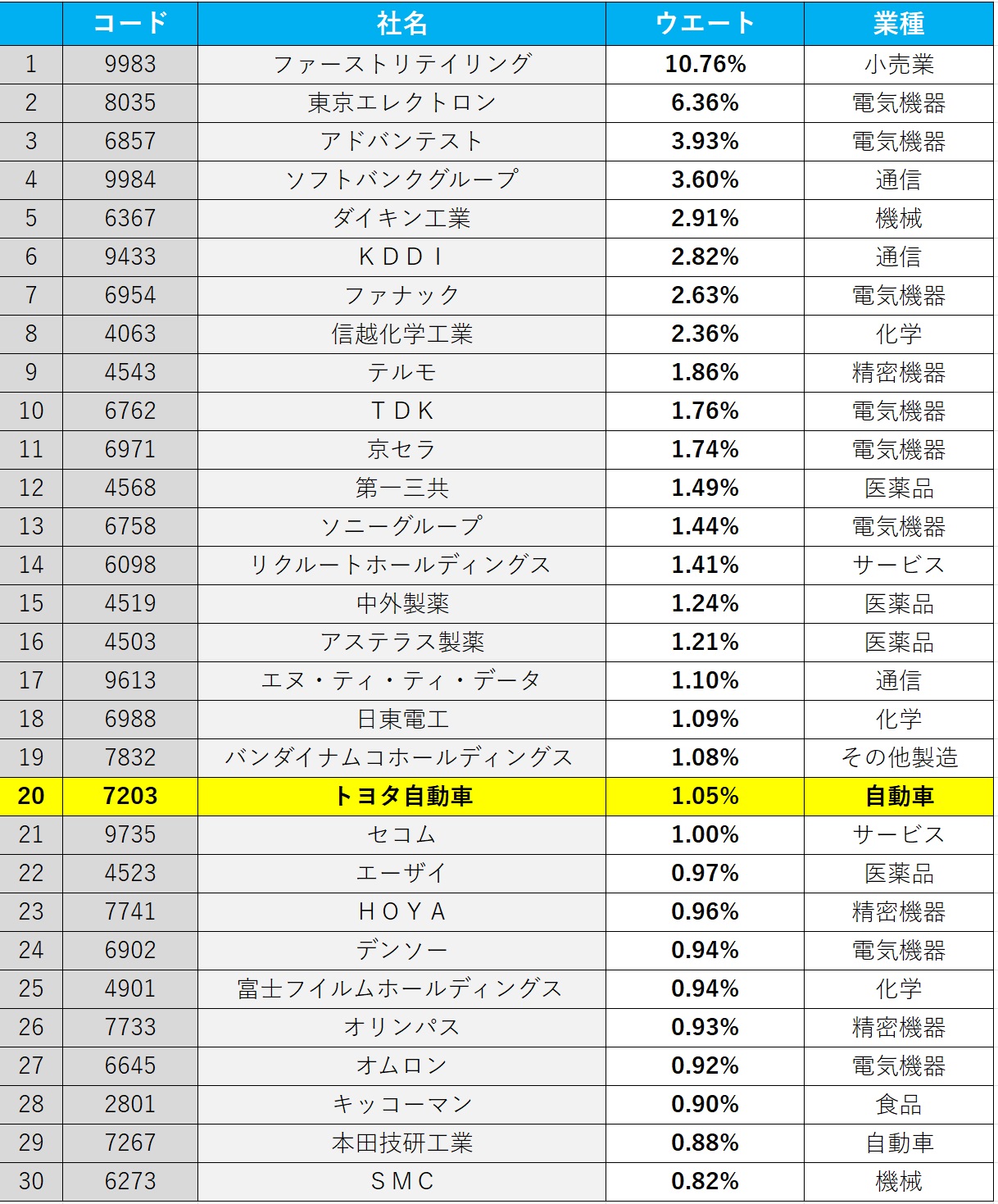 更に、日本最大の時価総額を誇るトヨタ自動車は20番目にランクされ、その指数ウェイトは僅かに1.05%でしかない。