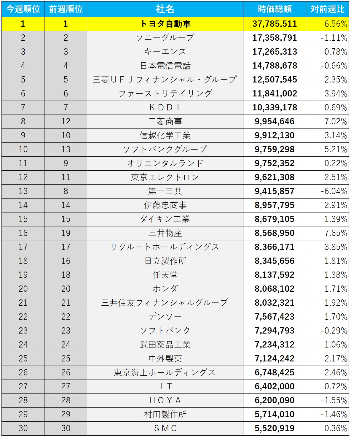 これは、先週末(6月16日現在)のデータで作った日本の全上場企業の株式時価総額の上位30社だ。