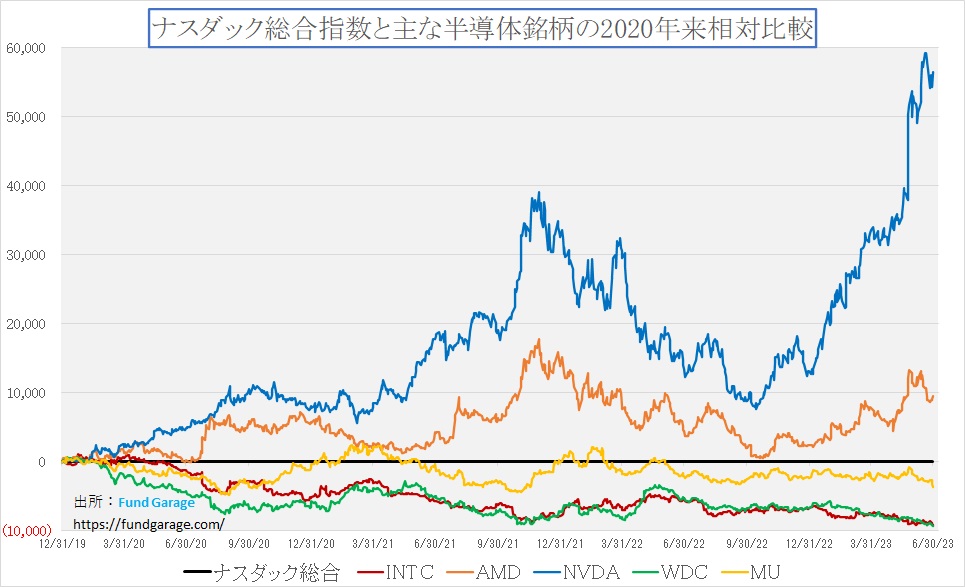 その意味では、GPUメーカーであったカナダのATI社を買収し、Radeonブランドの技術を吸収したAMDの株価が、パソコンやサーバ向けのCPU専業のインテル(メモリー事業は売却済み)とエヌビディアの株価トレンドの中間辺りに位置することが、現状を雄弁に語っていると思われる。