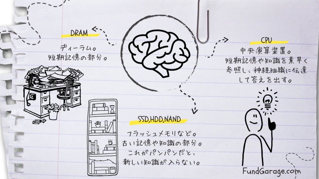 人間の脳は、短期記憶(DRAMなどのメモリーに相当)や、古くてしっかり脳に記憶したデータ(SSDやHDDに相当)を素早く参照しながら、それらを使って論理演算することで答えを出している。