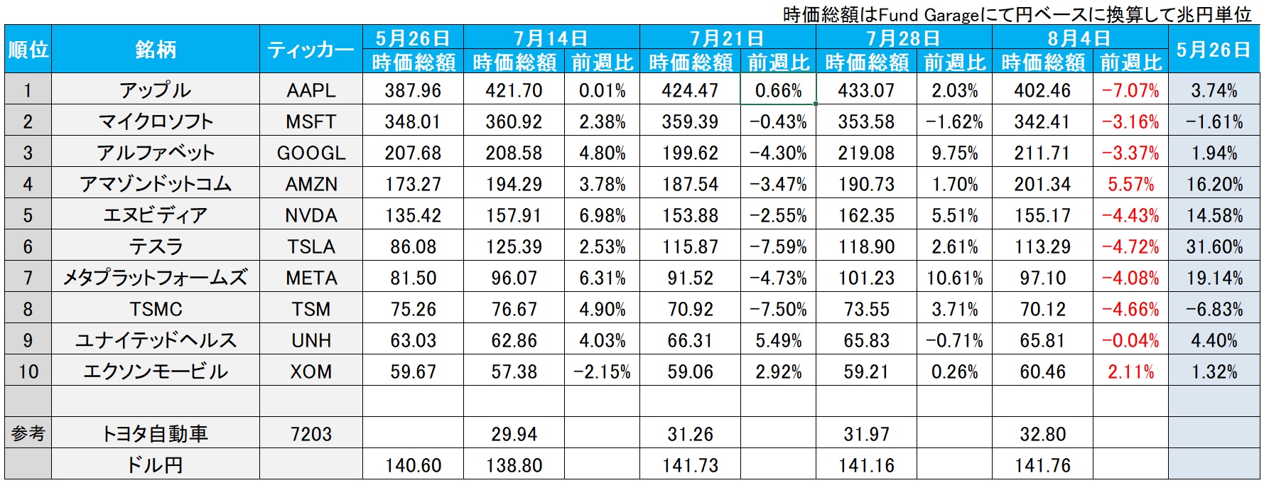 下の表を見れば明らかだが、米国の時価総額上位の銘柄は、5月末からの2か月間で1割以上も上昇していた。