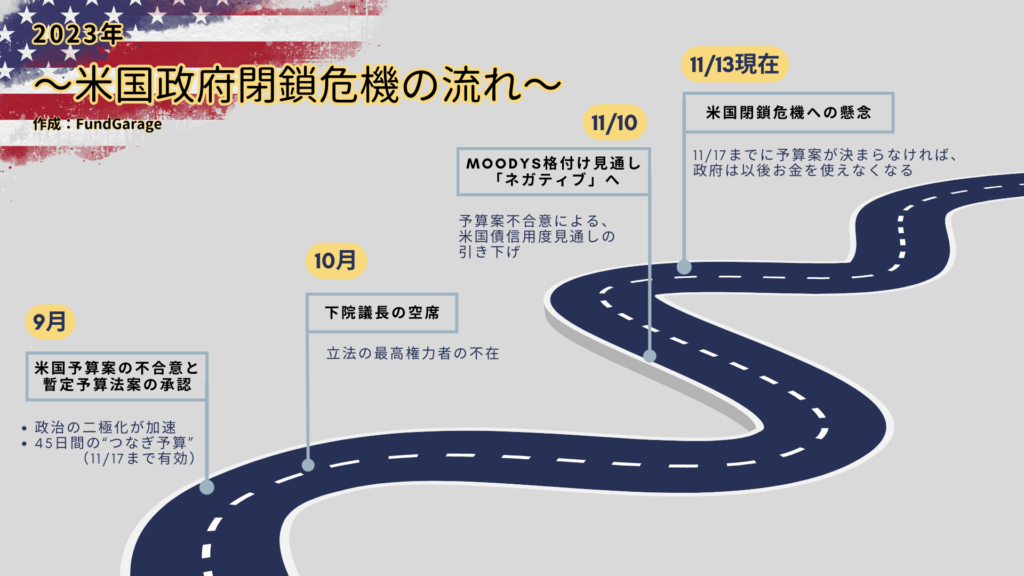 2023年11月10日、大手格付け機関のMoodysが、米国債の格付け見通しを「ネガティブ」に引き下げました。これは、11月17日を期日とする「暫定予算」と「米国予算案」の行方次第で、米国政府機関が閉鎖になるかならないかの瀬戸際にあったためです。