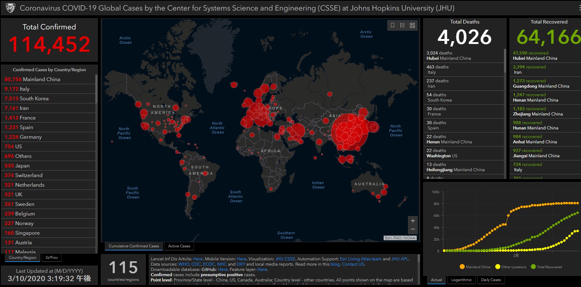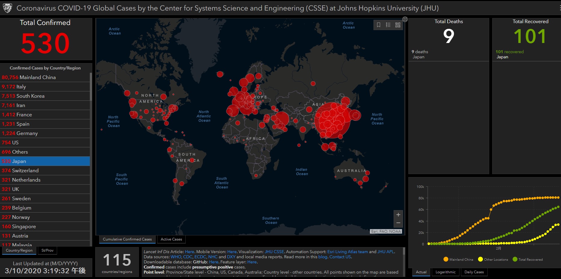 米国で最も権威のある医療大学のジョンズホプキンス大学が公開し、リアルタイムで更新されているWebデータがこちらの図。プレミアム会員の方達には既にお馴染みだと思うが、ご存知ない方もいらっしゃるので、Fund Garage を訪問をして下さった方にはご紹介しておきたい。国ごとにもデータがきちんと確認出来るすぐれものだ。