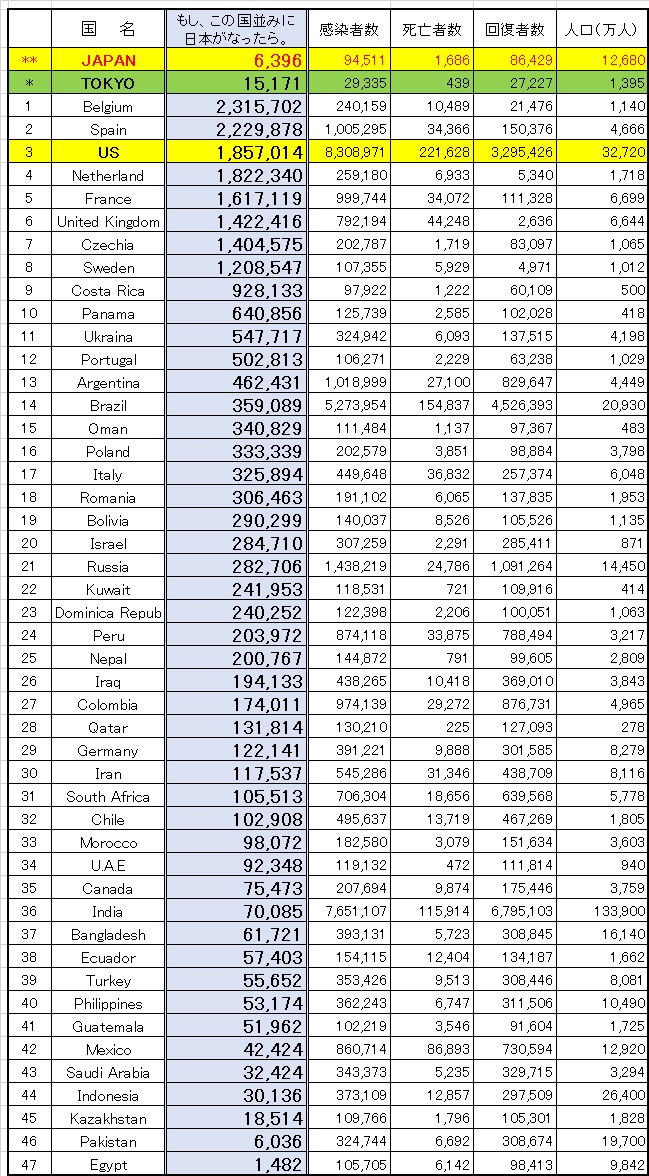 見方を変えれば、東京都で暮らしている人の目に移っている新型コロナウイルス・COVID-19の感染状況は、日本中に約15,171人のACTIVEな感染者がいるのと同じだということだ。これを、世界で今現在日本よりも感染者数累計が多い全47ヶ国に当て嵌めてみたのが下記の表である。まずはじっくりとご覧頂きたい。