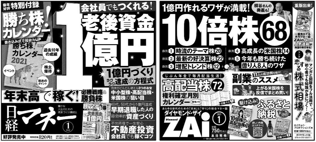 まず下の図を見て頂きた。これは日経新聞11月20日の朝刊に掲載されていたマネー雑誌「日経マネー」と同じく「ダイヤモンド・ザイ」の誌面広告だ。期せずして同じ日に、同じページにあったにも関わらず、どちらにも同じキーワードが入っているのがお分かりだろうか。そう「1億円」だ。前者は「会社員でも作れる!老後資金1億円」であり、後者は「1億円が作れるワザが満載!」という具合だ。「1億円づくりラクラク達成の方程式」なる見出しも前者にはある。要は「今の時代、1億円あったら良いなぁ」と考える方が多いということだろう。