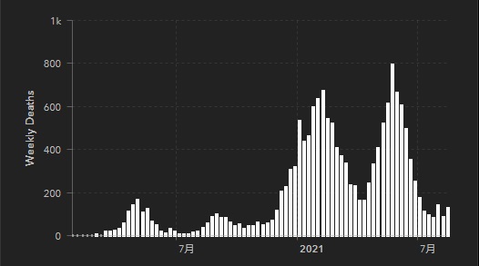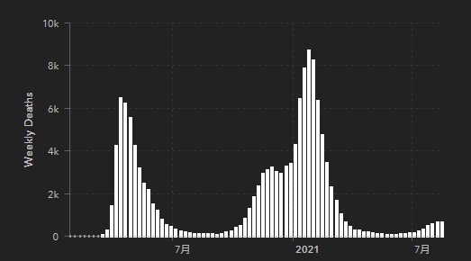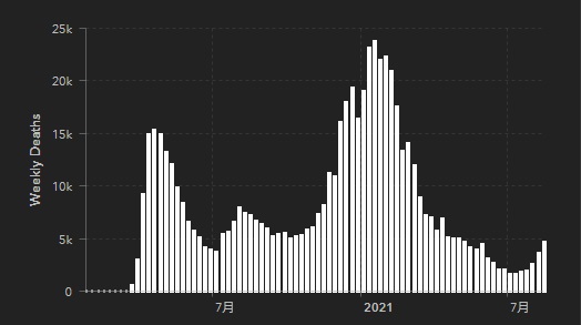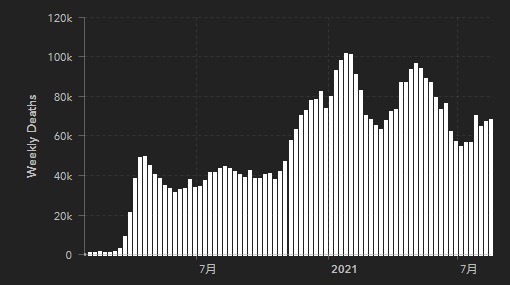 下記のチャートは全世界の死亡者数の推移を表している。感染者数の増加傾向値に比べると、ピークの高さは右肩下がりになっているようにも見える。ワクチン普及の効果と見ることが出来そうだ。また現在感染者数が増加しているのが、ワクチン未接種の人がデルタ変異株に感染し、そして重症化しているという話とこれは一致すると言える。
