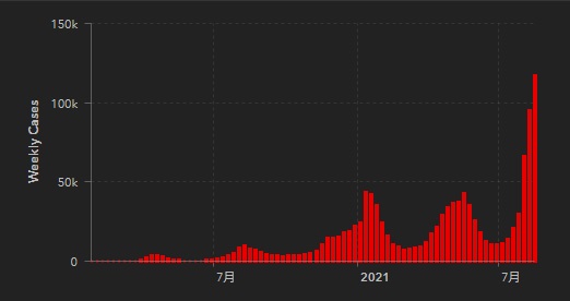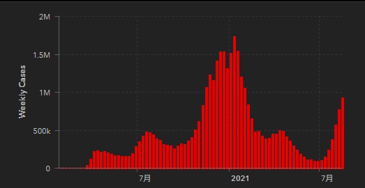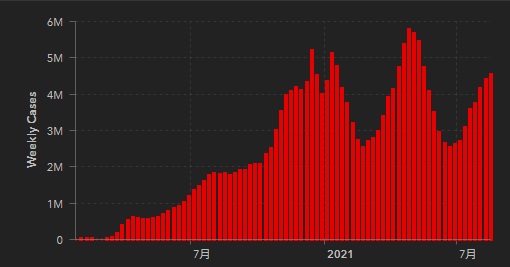 下記は全世界の感染者数の動向だ。従来集計してお見せしていたものとの大きな違いはDailyベースではなく、Weeklyベースに変わったところ。ただ充分にそのトレンドはこのチャートから把握することが出来る。現在、(恐らくデルタ変異株によって)感染者数の再拡大が起きているのは事実のようだ。