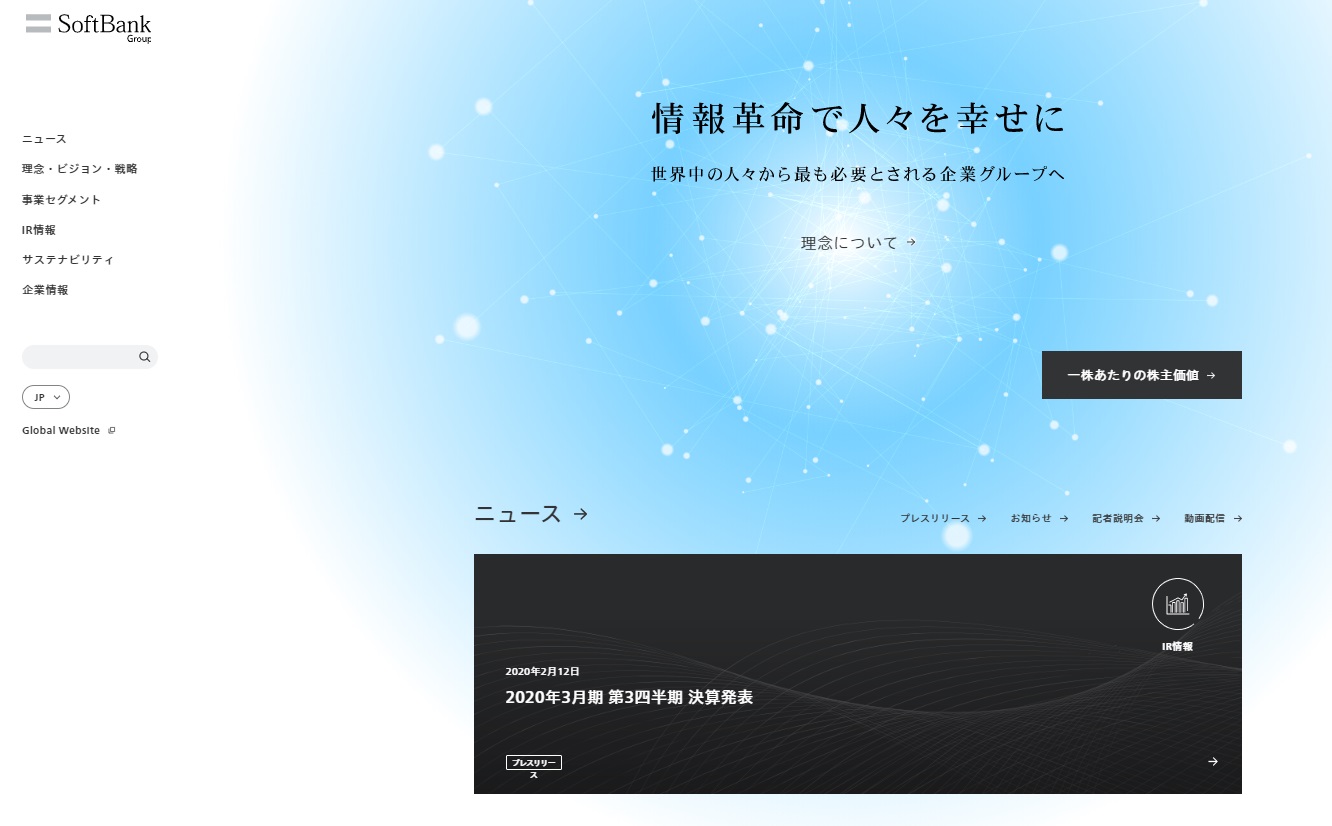 随分とさっぱりとしたと思われるかも知れないが、会社のWebページがいきなりリニューアルしていた。それがこれ。ただ目に付きやすいところに「一株当たりの株主価値」というバナーを配したところ、そのすぐ下に2月12日の決算発表の動画を置いたところに、孫社長の意図が垣間見える。