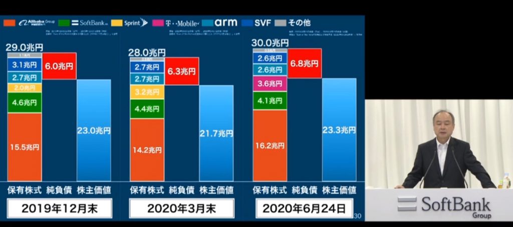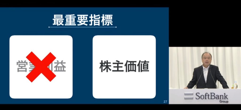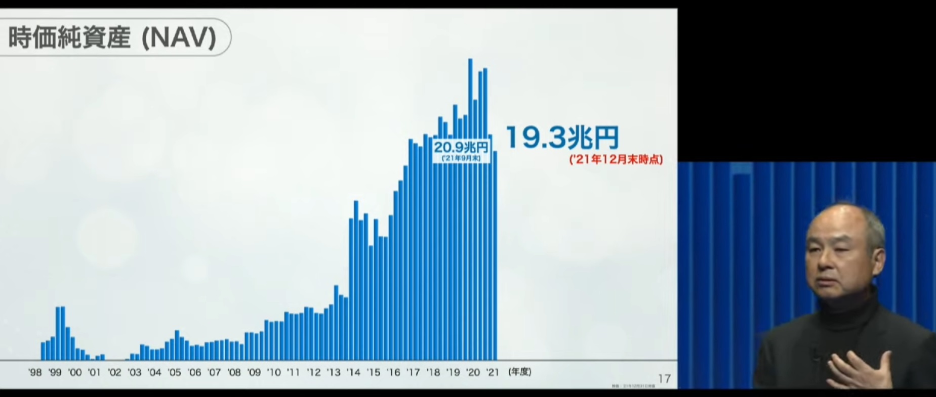プレゼンテーションが16-17分経った頃、話題は投資会社の最重要指標であるNAVの話になる。株主価値とか、純資産価値とかも言うがNet Asset Valueのことだ。ずっと孫さんは決算説明の都度、これだけをソフトバンク・グループは意識して経営していると言っているし、投資会社である以上、私はそれが正論だと思っている。だがそのNAVについて、孫さんが「NAVって分かる人?」と会場に問い掛けると、イエスと答えたのは僅か4人のようだった。5人に向けて話しているわけでは無い。そんなことも分からずに、ソフトバンク・グループの担当記者ですと経済系メディアの記者が務まるとは、この業界は酷いものだと思った。