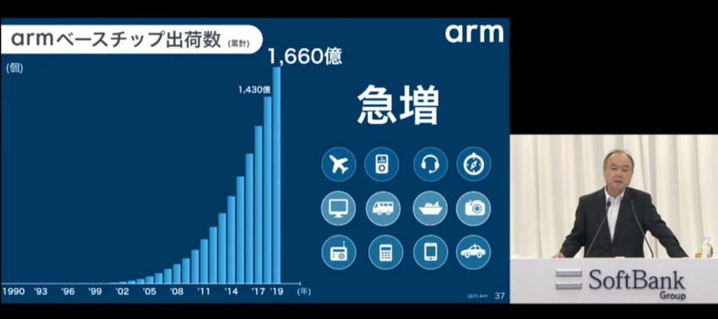 メディアの知ったかぶり屋さんたちは事あるごとに「ビジョンファンドが、Weworkが、Oyoが・・・」と枝葉末節な話をするが、同社のWebページに記されているように、投資会社としての同社の本来の株式価値を決定づけている銘柄は最上位のアリババから以下6位まで、下記の図の通りだ。ビジョンファンドは下から2番目、それ以外に個別に投資をしている者は名前すらも出て来ない。私から言わせれば「どこを見て、記者さん達は何の評価をしたいのだろう」といつも思っている。記者はアナリストではない。それに振り回されるアナリストも株式投資を一から勉強し直すべきだと思う。さて、それはそれとして、いま最も注目しているのは4番目のARMである。そもそも、私が再び「ソフトバンク・グループ来たぁ!」と思ったのは、2016年にARMの買収を発表した時だ。市場はこの買収を当初ストップ安として評価した。何故なら、英国ARMケンブリッジ大学の近くにある同社について、当時は日本の証券市場関係者は殆ど知らなかったからだ。今でこそスマホのCPUのアーキテクチャーはARMベースが殆どという程度の認識は生まれたが、当時はスマホのCPUはQUALCOMM製とまでは知っていても、そのアーキテクチャーがARMだとは知らない人が多かった。そこの巨額買収を発表したのだから、市場は非難ごうごうの中、ストップ安売り気配をつけさせた。