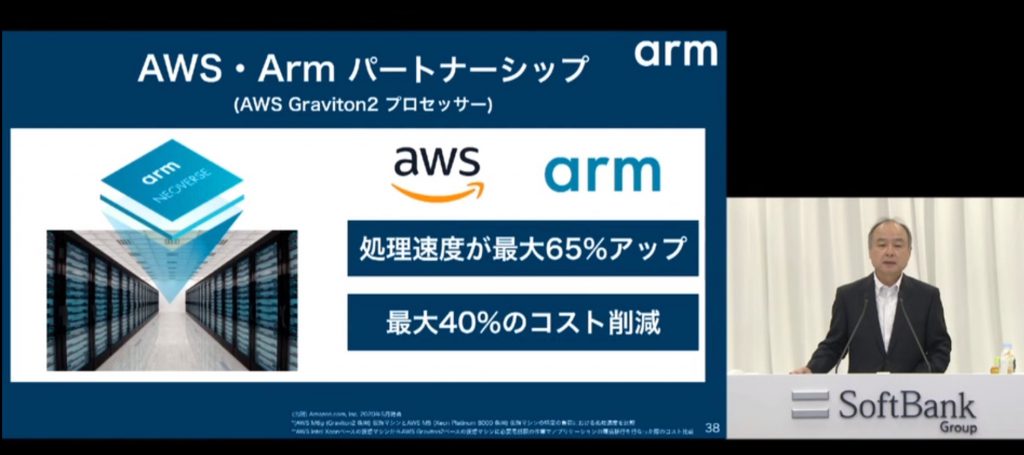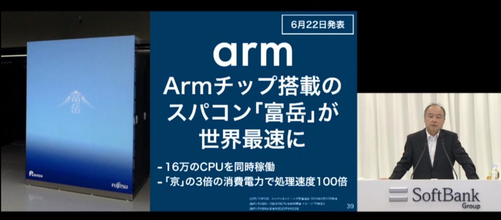 一例として、世界最速のスーパーコンピュータである「富岳」は富士通がアッセンブルしているが、CPUはARMアーキテクチャーのA64FXが158,976個使われており、各CPUには48個のコアが搭載されている。これらが可能な最大の理由は、ARMアーキテクチャーの基本が低消費電力だからだ。これをもしインテル・アーキテクチャーで作ったら、恐らく熱暴走という状態になるか、発火するほどに熱を持つか、或いは冷却装置の為にとんでもない規模の電力を必要としてしまうだろう。その背景を繰り返し繰り返し孫会長は説明していたが、理解されたとは言い難い。