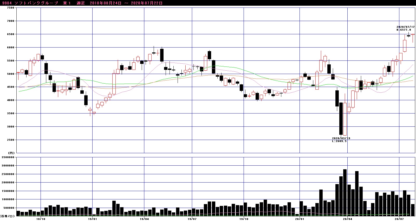 メディアがどう叩こうが上がるものは上がるということの証明みたいになっているのが昨今のソフトバンク・グループの株価だ。新聞や雑誌、或いはコメンテーターのしたり顔の説明を聞いているだけど、ソフトバンク・グループは明日にでもChapter-11を申請するのではないかという感じが続いているが、株価チャートはそうした論評をせせら笑うかのような動きをしている。これは週足、2018年8月24日からの株価推移である。今現在、最高値圏であるのは一目瞭然だ。