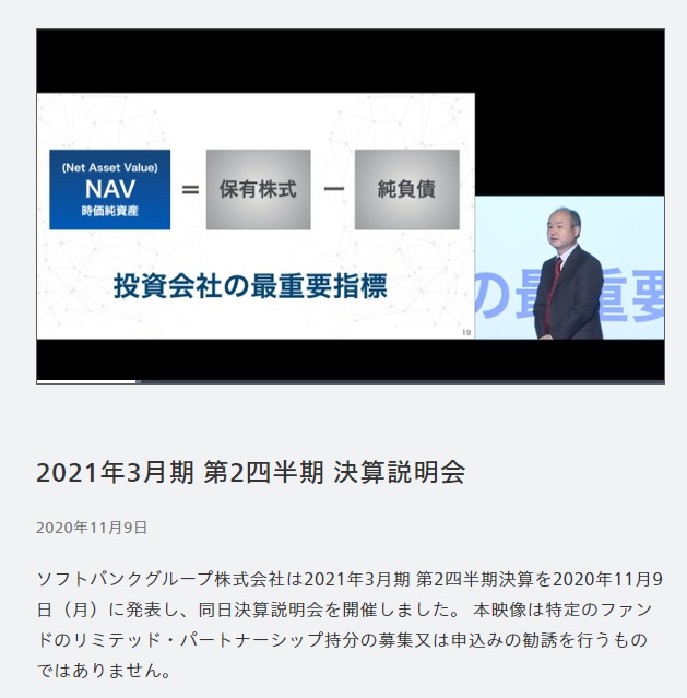 案の定、今朝の日経朝刊のソフトバンク・グループ関連の記事も酷いものだ。米国大統領選挙でメディアの世論洗脳の恐ろしさをまざまざと見たあとなので、この内容での刷り込みが行われたら、孫さんも浮かばれないなと真剣に思った次第。結論を言えば「凄い会社だなぁ」と私は称賛する。だから是非、ご自身で決算説明の動画をこれからでも見て頂きたい。下記の写真をクリックすれば、そのWebページに飛ぶように設定してある。