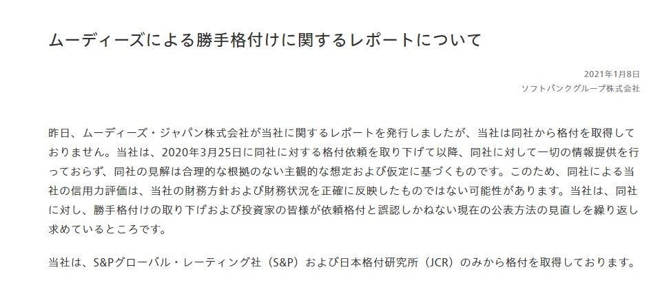 その下には、「ムーディーズの格付け取り下げについて」というプレスリリースも掲示してある。頑張れ、SBG!!