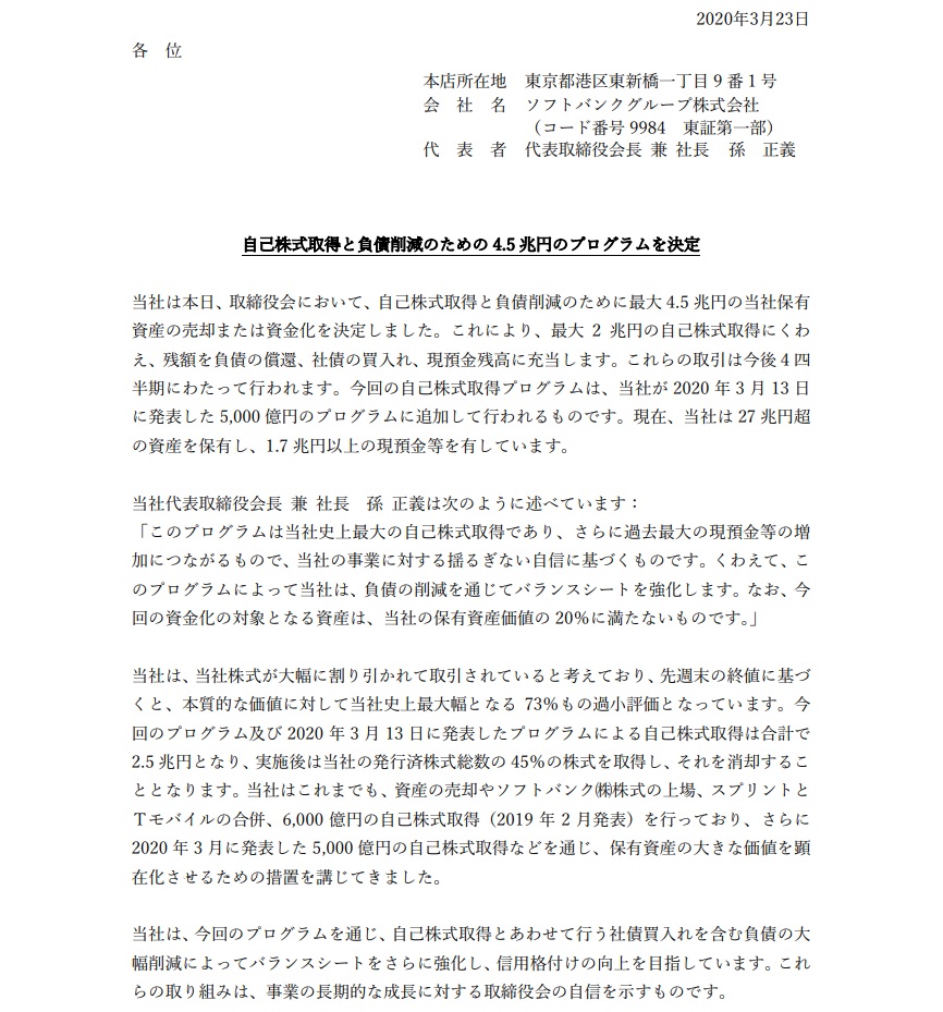 自己株式取得と負債削減のための 4.5 兆円のプログラムを決定を発表し、株価はストップ高となった。プレスリリースの中で孫社長は「当社株式が大幅に割り引かれて取引されていると考えており、先週末の終値に基づくと、本質的な価値に対して当社史上最大幅となる 73%もの過小評価となっています。」言い放っています。画像をクリックすると原本のPDFが開きます。