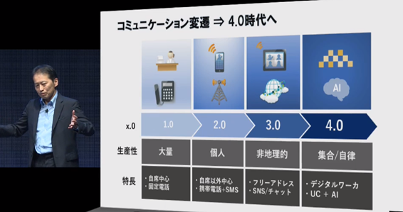 上述の基調講演以外にも多くのセッションがあったのだが、ひとつご紹介したいのがソフトバンクとマイクロソフトが提供を始める新サービスだ。それをコミュニケーション4.0という形で説明していたが「音声をクラウドデータ化(デジタル化)して、それをAIと組み合わせる」というものだ。