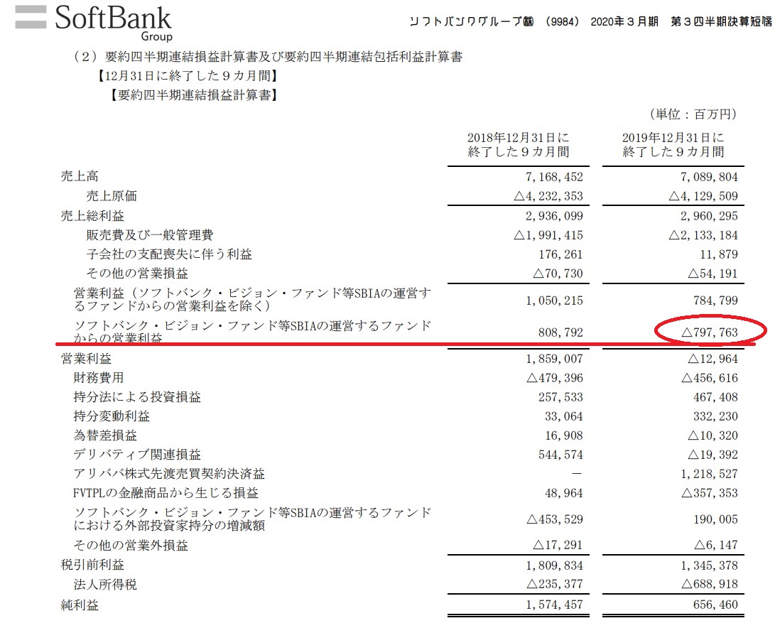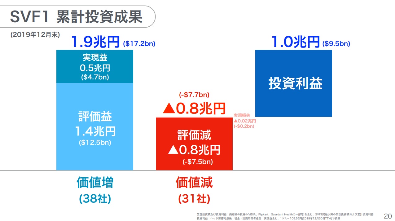 つまり、この第4四半期でソフトバンク・グループは△1.4超円の時価減少(△6..09%)となり、投資信託の基準価額で言うならば、2019年12月末を10,000円とすると609円マイナスの9,391円になったということだ。これは同期間の日経平均株価(△14.89%)、TOPIX(△15.22%)、JASDAQ(△15.22%)、NYダウ(△13.81%)より遥かに良好であり、S&P500の△8.57%より多少良好、マザーズの△2.78%やNASDAQの+2.93%よりは劣るということではないだろうか。
