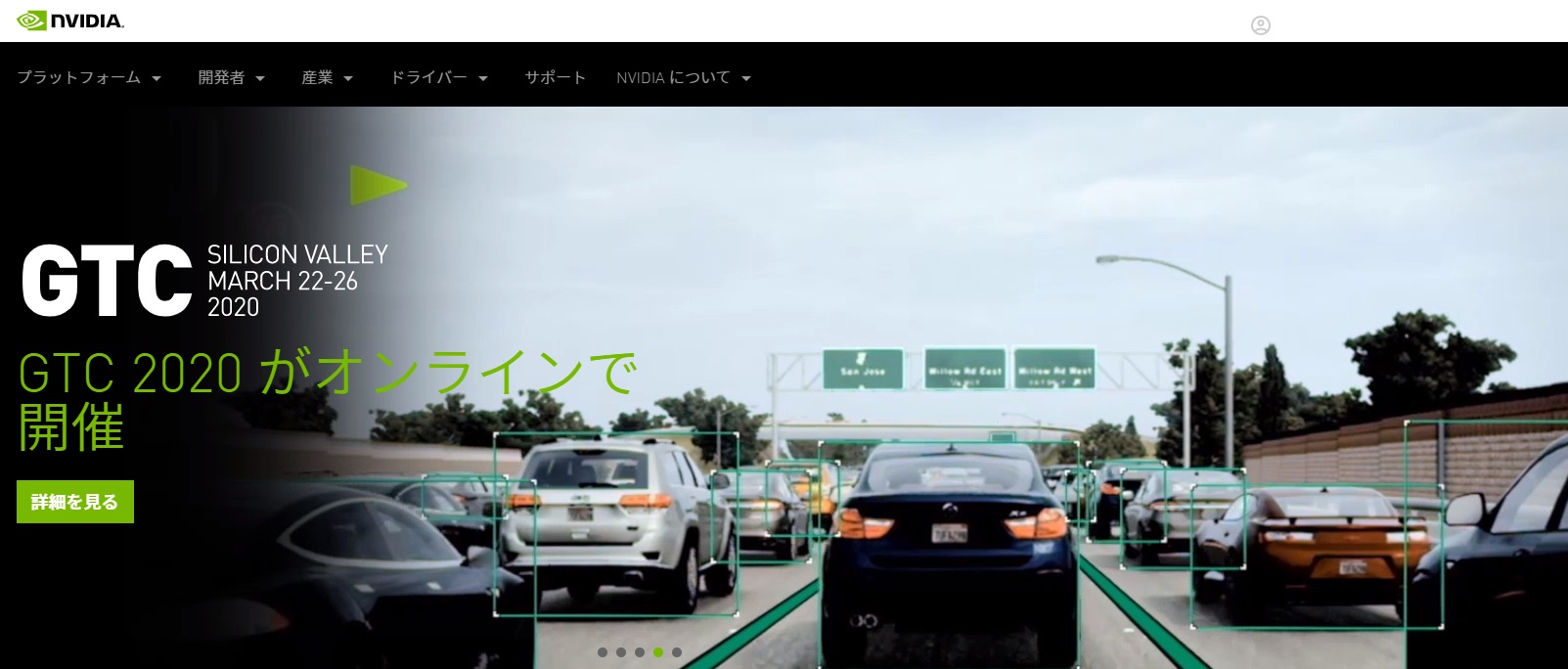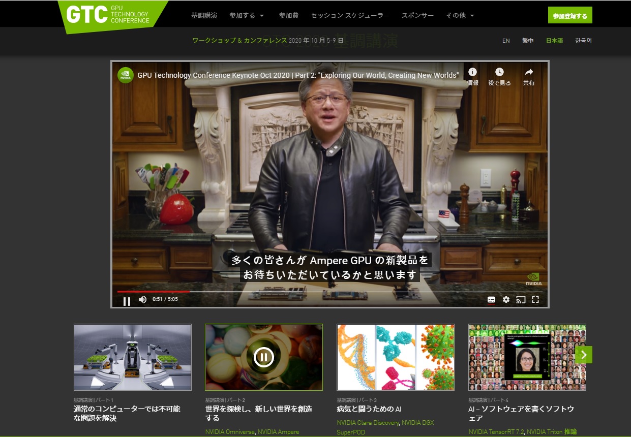 下記画像をクリックすれば、GTC2020のページにジャンプするので、是非内容をチェックして欲しい。画像自体は同社日本語ウェブサイトのトップページ。