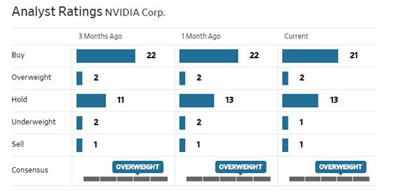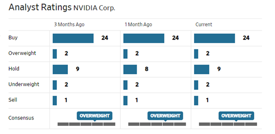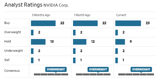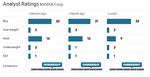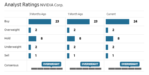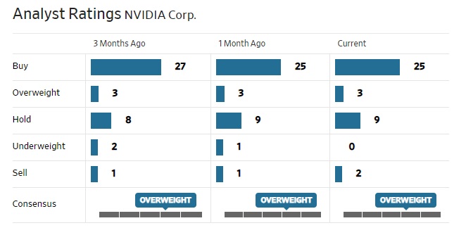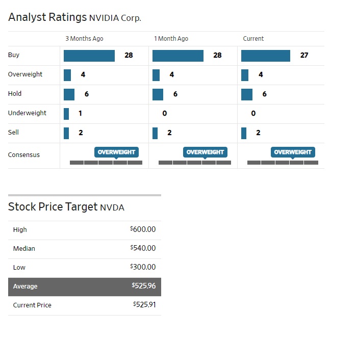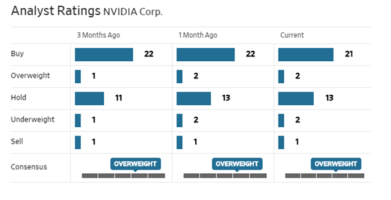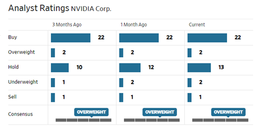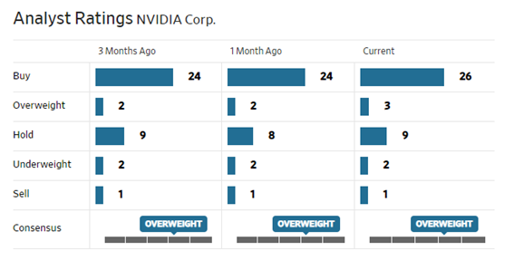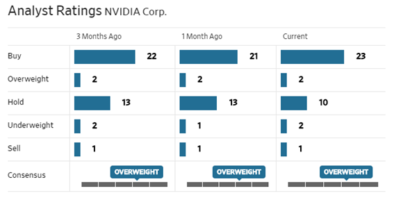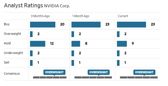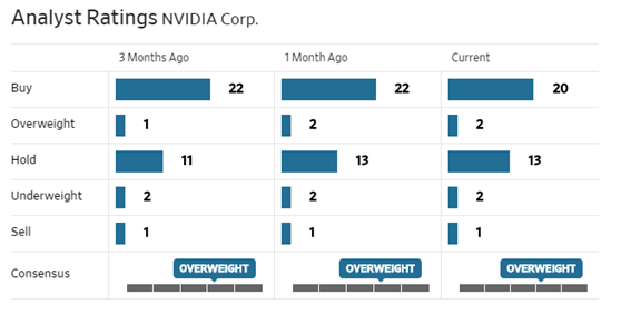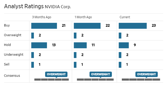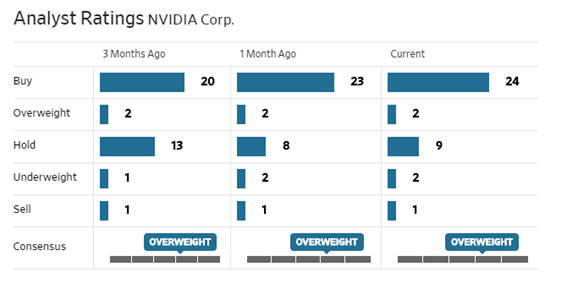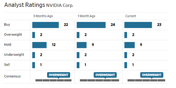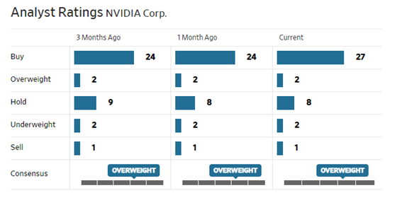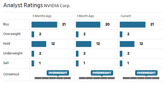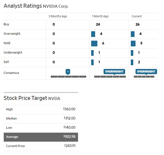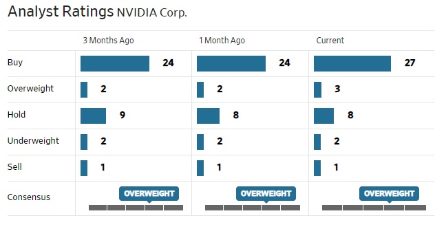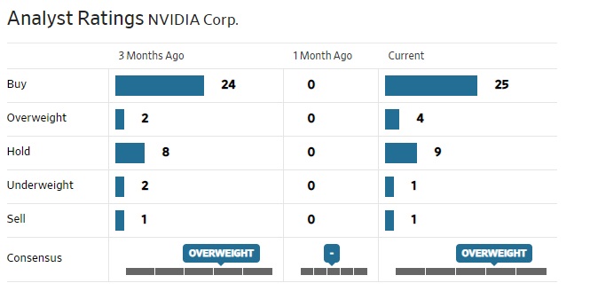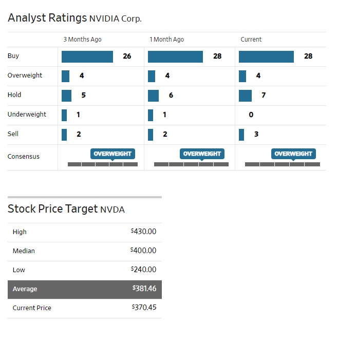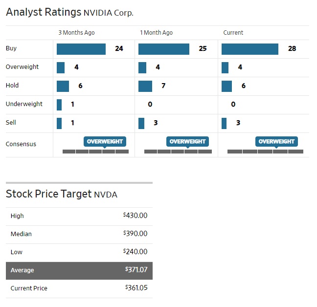 前回「米国のアナリスト達の予想も強気ながらも、ターゲットは$371.07が平均値と、もう少しで届いてしまうところまでは来ている。だが、今回の決算発表、そしてそれ以前のGTC基調講演などを考えると、これらターゲットプライスは上方修正されると読んでいる。」とコメントしてから4週間、その結果を検証してみよう。同じように週足チャートとアナリストのレーティングの状況を下記にお示しする。
