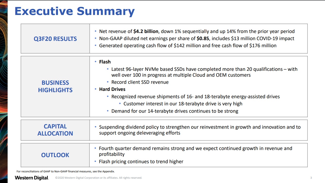 4月30日米国市場引け後にWestern Digitalが2020年第3四半期の決算を発表した。決算内容自体は良かったと思う。実績はRevenueで$4.18B(+13.9% YoY)と$20M市場予想を上回り、EPSもNon-GAAP EPSは$0.85で$0.07ミスったものの、GAAP EPSは$0.06と$0.15市場予想に勝っている。