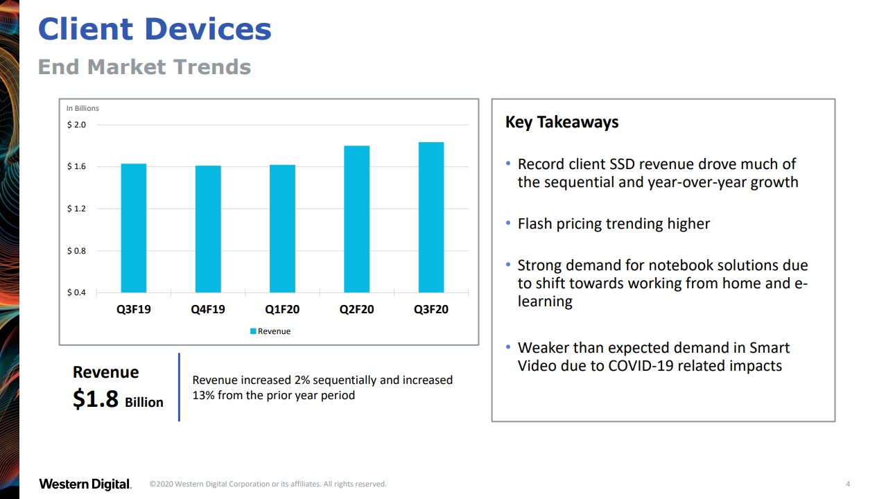 次のスライドはクライアント・デバイス・セグメントと言って、最終市場の動向を示している。Revenueは$1.8Bある。SSDが好調、またFlashメモリーの単価が上昇基調である。そして感じなのがnotebook向けの製品に強いディマンドがある。これこそがテレワークなどの影響だ。ただ外出が出来ないこともあり、Smart Videoは売れなくなっている。ただそれでも前四半期より2%増収となり、YoYだと+13%だ。