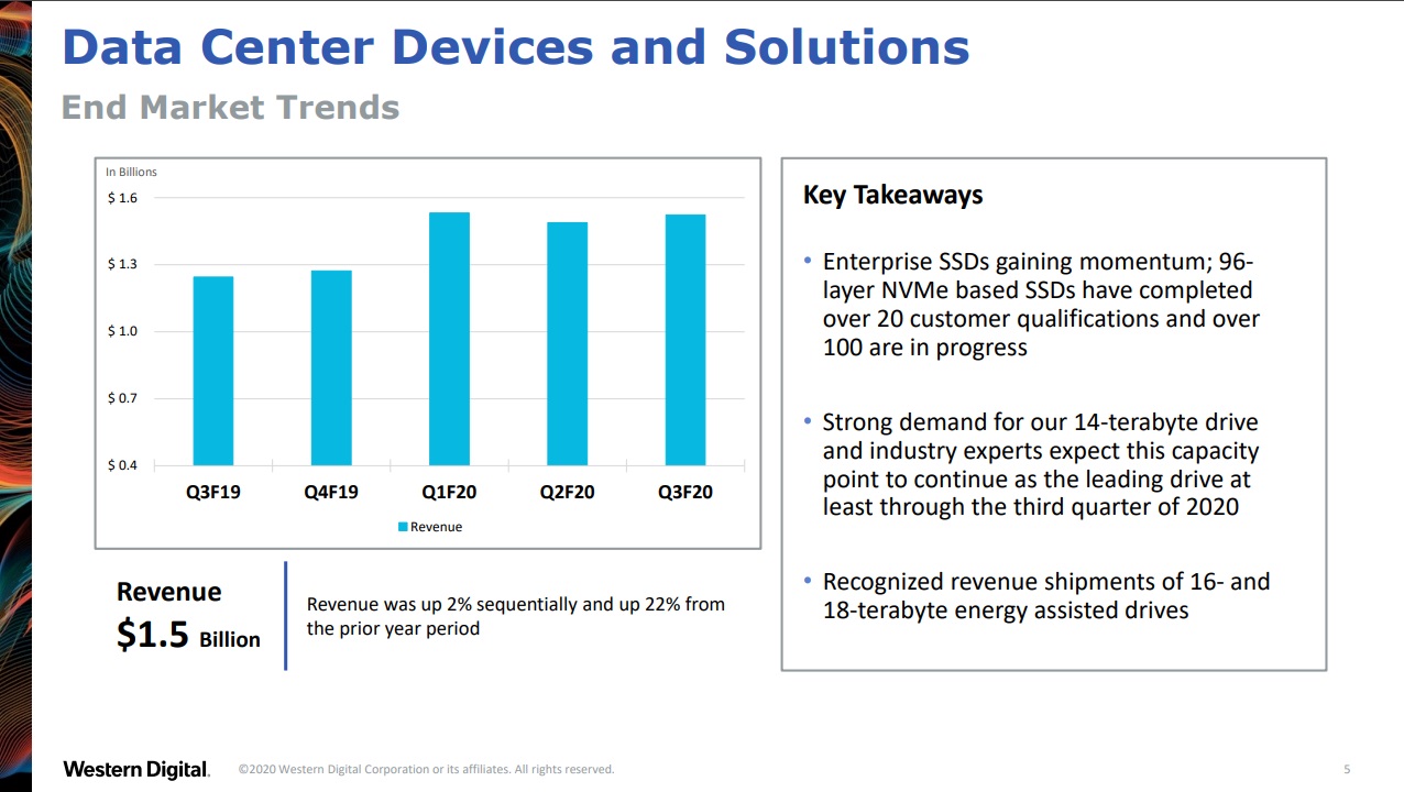 業績の数字は冒頭にお伝えした通りだが、その次のFlashとHard Driveのビジネス・ハイライトが良い。最新の96層NVMe SSDが決算説明の中でも触れられているが、既に20社以上で評価承認が終わって、更に100を超えるクラウドやOEMカスタマーで審査進行中である。またHDDについては、最新の18TBのHDDに既に引きが入っているようだ。