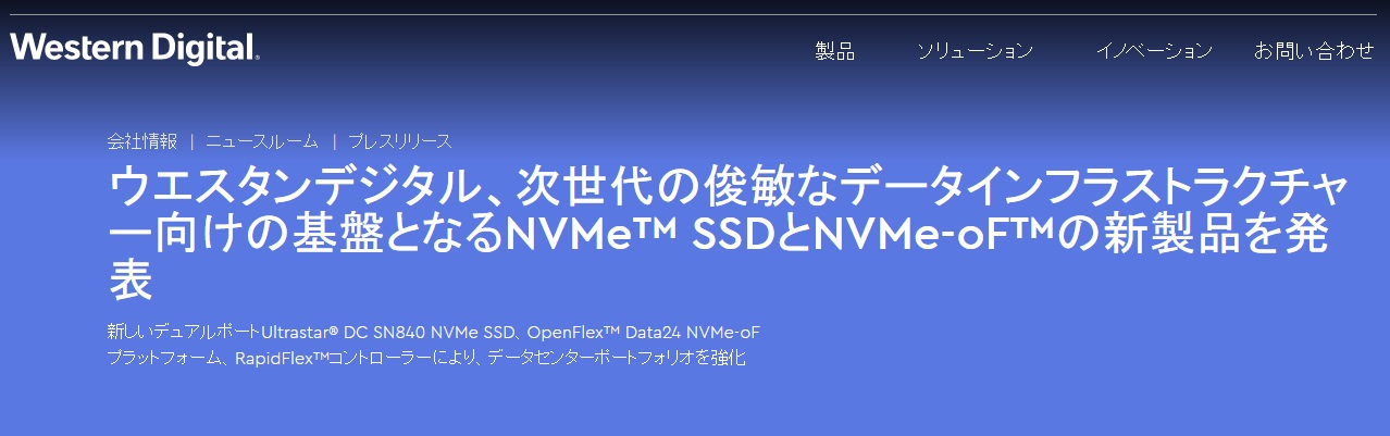 例えば「IT調査会社IDCではハイパースケーラーや、OEM、エンドユーザーのIT組織がレガシーSATAやSASインターフェースから離れつつあり、NVMeは2020年のエンタープライズSSDの総出荷台数の55パーセントに達し、2018年から2023年のCAGRは38パーセントになると予測しています」であるとか、これを受けてIDCのリサーチバイスプレジデント、Jeff Janukowicz氏のコメントとして「スピード、効率、容量、コスト効率の高い拡張性を実現できるNVMeがフラッシュの未来であることは疑いがありません。そしてNVMe-oFによってこれが次の段階に引き上げられます。多くの高性能アプリケーションがまたたく間に主な事業部門を支える中核となり、これにより世界中の企業のデータセンターでNVMeがさらに拡大すると考えられます。ウエスタンデジタルはNANDフラッシュ革新の長年の歴史、そしてNVMe SSDと新たなデータファブリックソリューションの統合ポートフォリオにより、顧客のNVMe採用やストレージ資産の最大限活用について支援できるようになります。」などを引用している。まずはプレスリリース全体を見て欲しい。