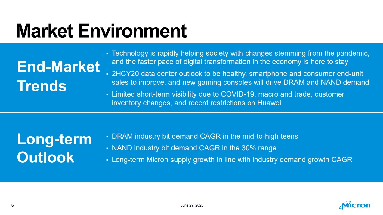 上段にあるのが最終市場の動向だが、まず2020年度下半期のデータセンタの設備投資見通しは良好であり、スマートフォンなどの最終端末も力強い。そして新しいゲームコンソール(PS5など)の需要がDRAMとNANDの両方を牽引しているとある。またCOVID-19、マクロ、貿易、顧客在庫の変化、そして最近のファーウェイ向け規制は短期的には現状特に影響はない。ウェスタンデジタルに関わるところでは、長期見通しとしてNANDの成長が30%年率を見ているということで、データセンタの需要と合わせ、期待が持てる。