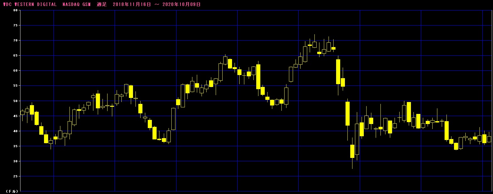 マイクロンテクノロジー(MU)が上方修正した決算を発表しても、NANDフラッシュメモリーの価格が上がってきていることを説明しても、米中間の緊張激化などの方が、半導体メモリー価格の下落を想起させるのか、メモリー関係の半導体銘柄の株価運びは遅い。相当な弱気論者が市場にはいるようだ。MUと同様にその流れ弾を受けてしまっているのがWDCだ。