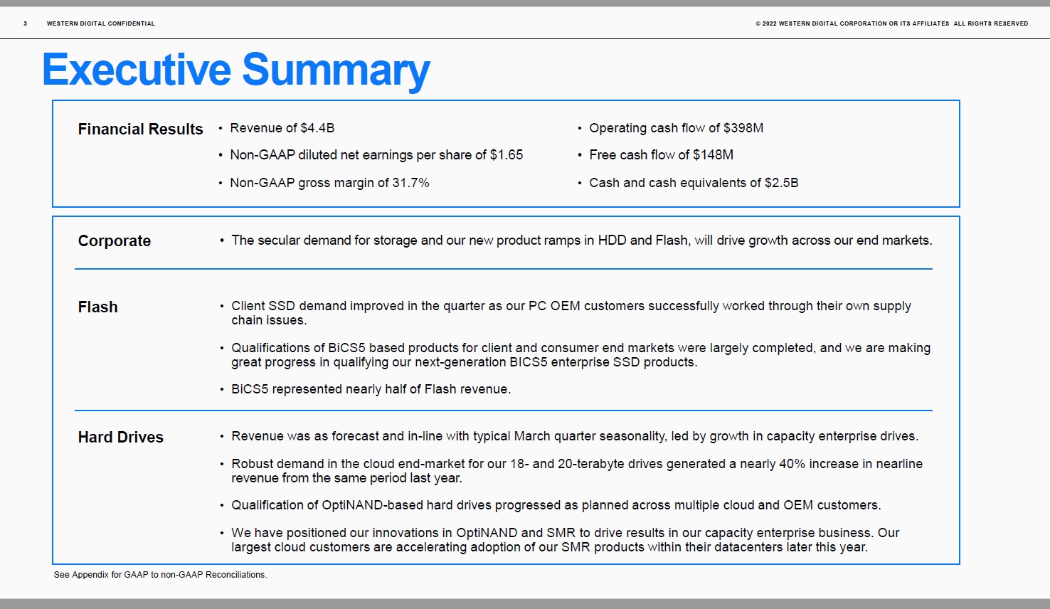 “In summary, we are successfully navigating dynamic market conditions. Our hard drive business is performing well and we believe that the flash market has reached a cyclical trough.” (要約すると、当社はダイナミックな市場を上手く進んでいる。ハードディスクのビジネスは上手くいっているし、我々はフラッシュメモリが循環的な谷間に到達していると考えています)