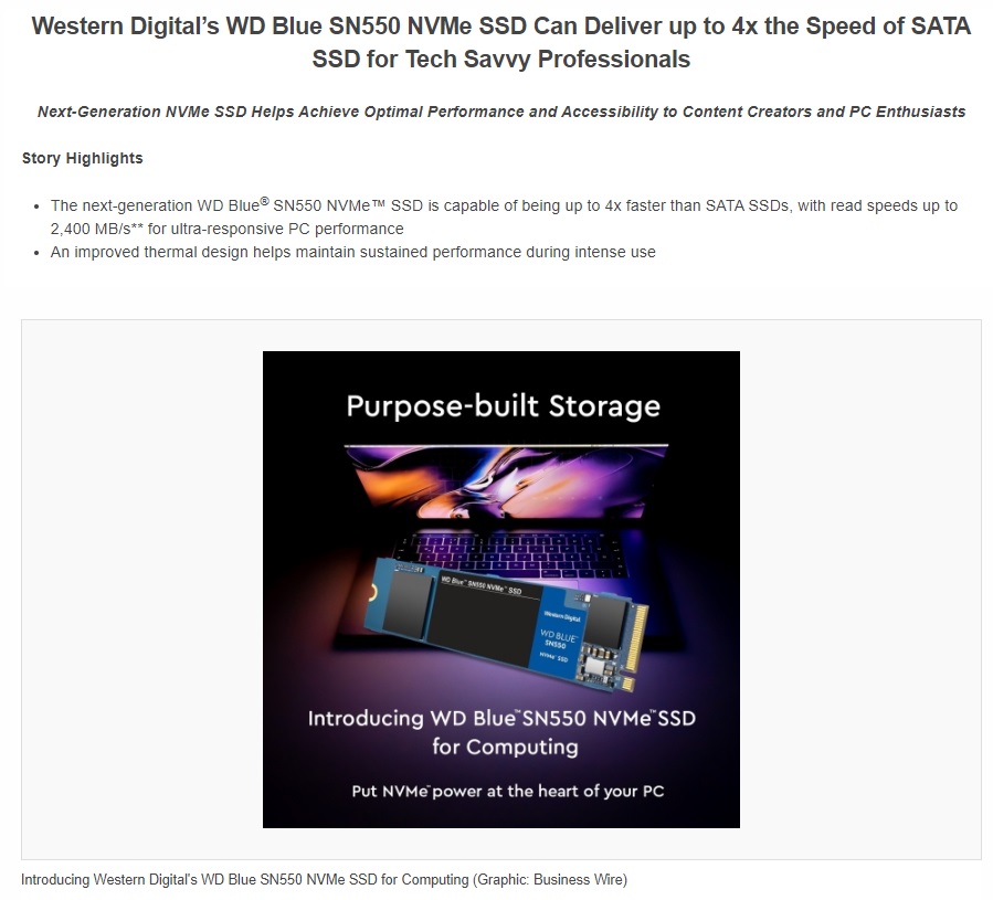 3/14にWD Blue SN500 NVMe SSDを追加し、NVMe製品のパソコンへの普及促進を狙う。消費者が求めるより高速で応答性の高いコンピューターのためパソコン業界では、SATAからNVMeプロトコルへの移行が進んでいる。