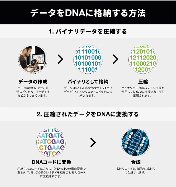 DNAデータ・ストレージとは、勿論、あの生物学のDNAのことで、現在2進法の0か1で処理されているバイナリ・コンピューティングという世界を、DNAのデータの保持方法、A、C、T、Gの4つのキーを使った螺旋階段上のものに置き換えるというものだ。DNAストレージという考え方自体は昨日今日のものではないのだが、現時点で存在しているものは、とてつもなく高価なものになる。