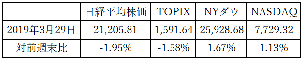 先週(3/25~3/29)は前週末の米国市場の急落を嫌気して週初に日経平均株価が650円の下落となったこと、また期末の配当落ち(171円程度)が日本の株価を押し下げたと言える。前週末と日米逆の状態である。
