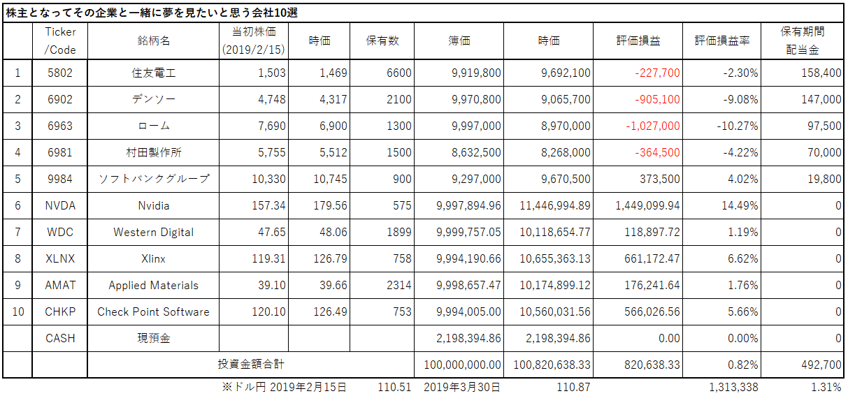 *上記表について:日本株、米国株からそれぞれ上限を5銘柄として絞り込み、ひと銘柄当たりの投資余力を10百万円として、株数を計算。売買手数料は証券会社によって違うので考慮していない。ビジネストレンドや各企業の状況により適宜入れ替える。ロスカット、益出しルール等の設定はしない。