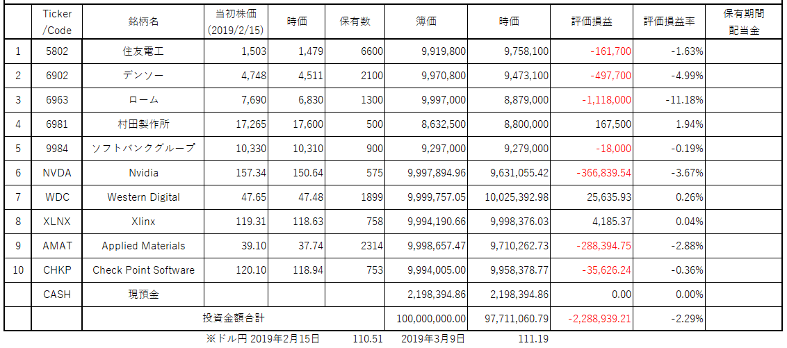*上記表について:日本株、米国株からそれぞれ上限を5銘柄として絞り込み、ひと銘柄当たりの投資余力を10百万円として、株数を計算。売買手数料は証券会社によって違うので考慮していない。ビジネストレンドや各企業の状況により適宜入れ替える。ロスカット、益出しルール等の設定はしない。