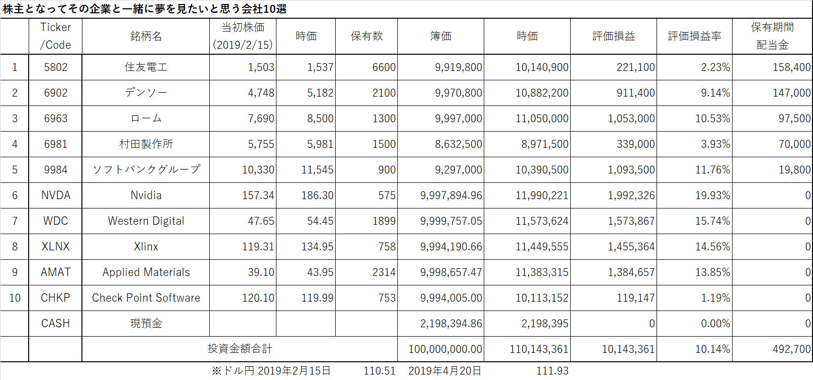 *上記表について:日本株、米国株からそれぞれ上限を5銘柄として絞り込み、ひと銘柄当たりの投資余力を10百万円として、株数を計算。売買手数料は証券会社によって違うので考慮していない。ビジネストレンドや各企業の状況により適宜入れ替える。ロスカット、益出しルール等の設定はしない。