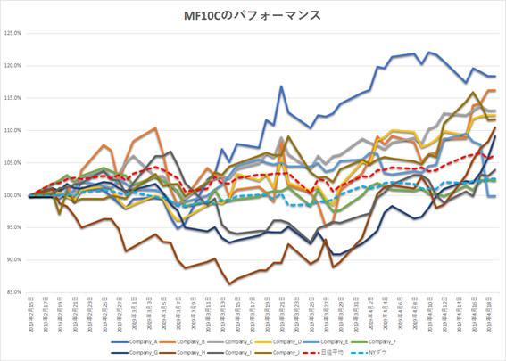 今週から、MF10Cの個別銘柄の変化率のチャートを、2か月余り経過したこともあり、下記のようにお示しすることとした。点線で日経平均株価とNYダウも示したので、合計12本のラインが混線しており、やや見難い感じは否めないが、その点だけご容赦頂きたい。