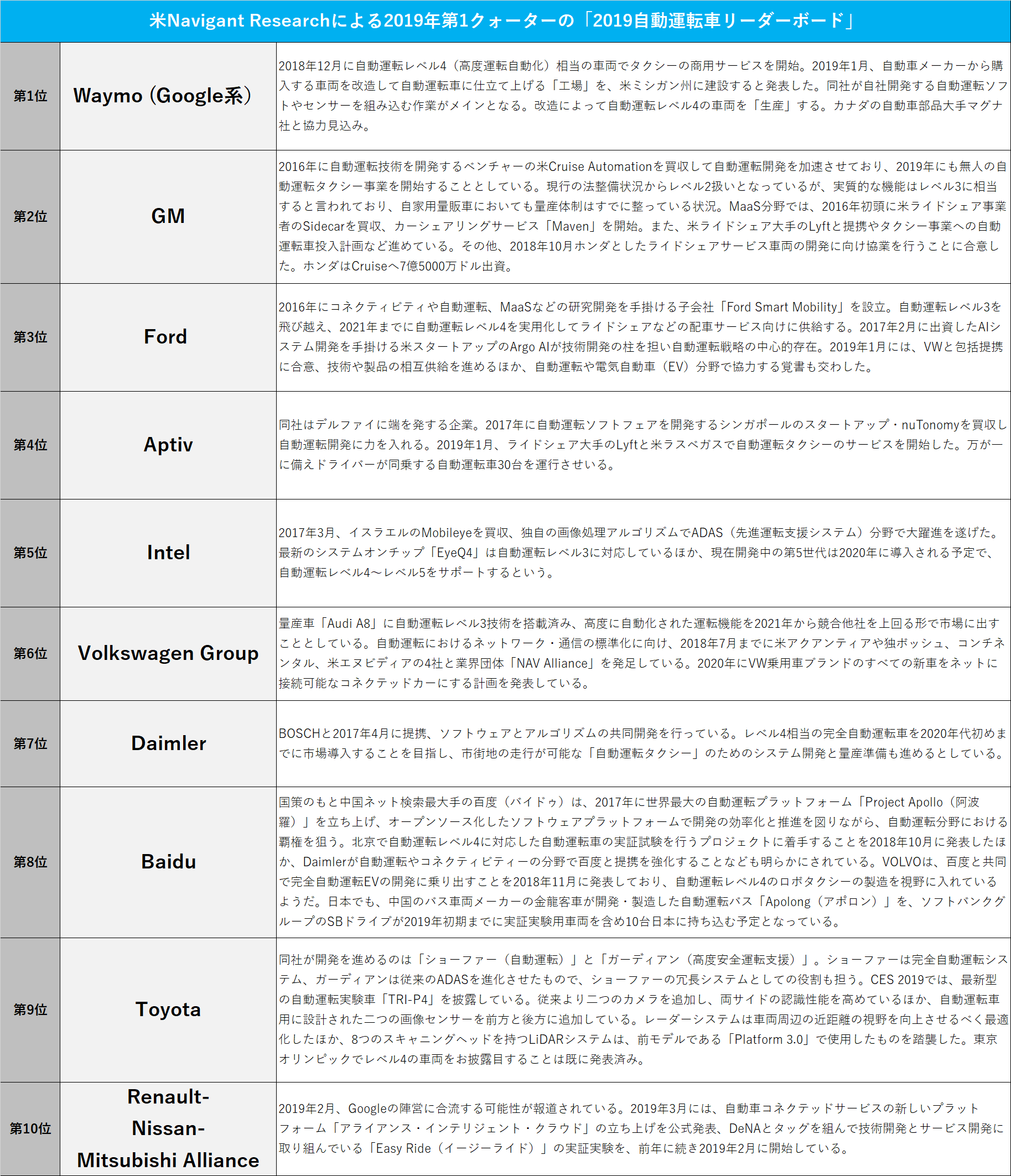 米Navigant Researchによる2019年第1クォーターの「2019自動運転車リーダーボード」