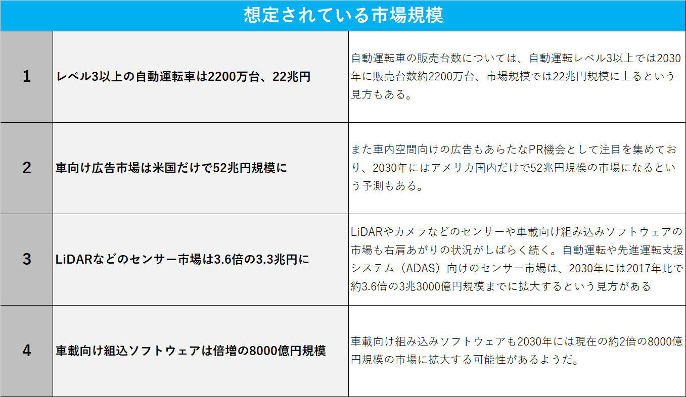 下記に自動運転関連の想定される市場規模を纏めた表を示す。面白いのは、自動運転車の車内空間向けの広告市場の規模である。米国だけで2030年には52兆円規模もあるという。これはその頃までには5Gも整い、完全自動運転のクルマがそれなりな量が市場投入されているからという読みも含まれているからだろう。