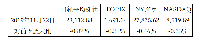 今週木曜日28日のサンクスギビング・デーを前に、先週の市場は既に膠着状態となった。前週末に達成したNYダウの28,000ドル乗せも3日ももたずに割り込んだ。期待感高まる米中貿易摩擦問題の決着に少々暗雲が立ち込めたというのが大方の見方だ。ただ総じてニュースフローに乏しいのが膠着の原因だろう。米国債のイールドカーブはよりフラットニング化が進んだ。恐らくこのままサンクスギビングの休暇ウィークに入るため、米国市場の動きはより乏しくなり、それを受けて日本市場も膠着すると思われる。何事も無ければの話だが。